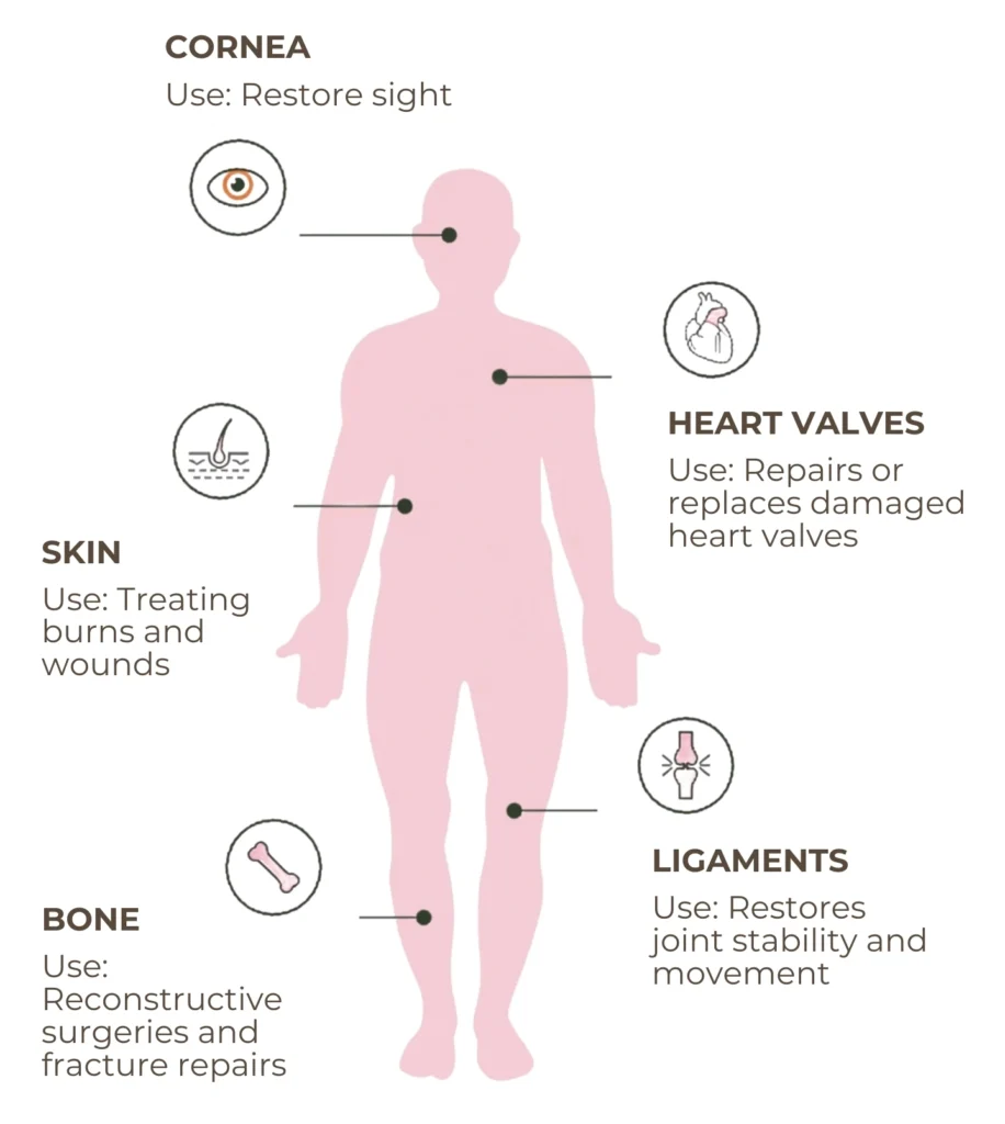Beyond corneas, other tissues (including bone, skin, ligaments, and heart valves) can be donated. Collectively, a single donor may help improve the lives of more than 50 patients through various medical procedures.